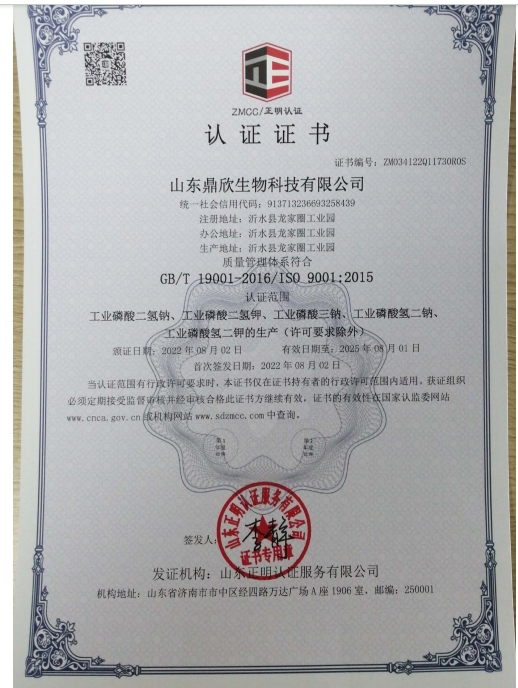 山东鼎欣生物科技有限公司是一家专业生产磷酸盐的企业,该公司创建于2007年,占地面积15000平方米,总投资1500万元,其中环保投资202万元。我公司以工业级磷酸盐系列为主体,主要生产磷酸二氢钾、磷酸氢二钾,磷酸二氢钠、磷酸氢二钠、磷酸三钠、磷酸二氢铵、磷酸氢二铵、醋酸钠、三聚磷酸钠、三偏磷酸钠六偏磷酸钠、焦磷酸钠等产品,质量均达到国家标准。广泛应用于食品、洗涤剂、冶金、水处理、建材、医药以及石油化工等。2014年,新上食品级磷酸盐生产车间,主要生产食品级磷酸二氢钠,磷酸氢二钠,磷酸三钠,磷酸二氢钾等产品。主要用于医药中间体,发酵,洗涤,水处理等方面。我们严格按照国家最新标准进行生产,已于2008年顺利通过了GBT9001-2000 IDT ISO9001:2000质量管理体系认证和GBT24001-2004 IDT ISO14001:2004环境管理体系认证。已通过领取了安全生产许可证。